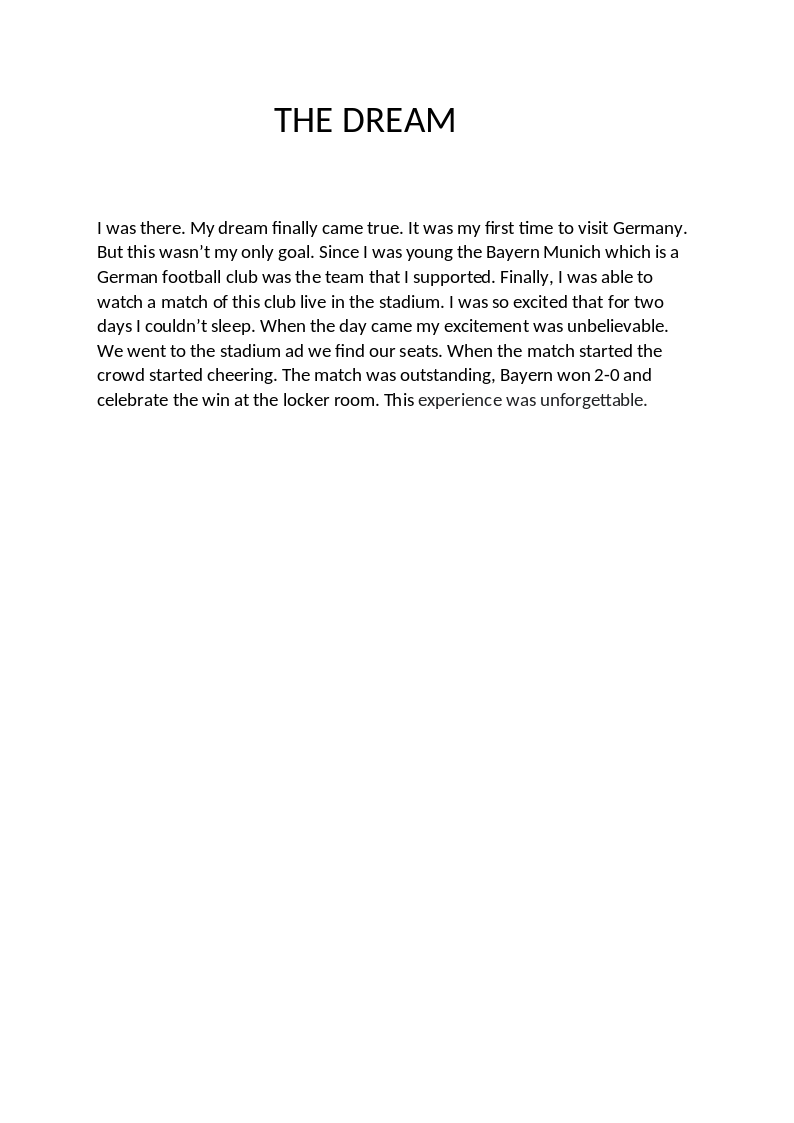 Eiffel tower is located in France (Paris). It is a really tall building, which was built in the 19th century. Many tourists visit it, so they can take pictures of all the city. It's height is 501ft and it is the most popular and impressive landmark in France. When I visited it, some random guy was looking at me, holding a weapon. When I saw him, I started running asking for help. No one paid attention to me. It was like I was not even there! Then I felt something really weird. The alarm clock which I had in my room started ticking. After all, I realized that this adventure was luckily a dream!